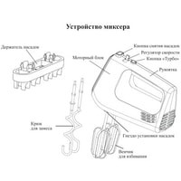 Класс защиты от поражения электрическим током: II;Материал корпуса: пластик;Материал насадок: хромированная сталь;Размеры: 195x95x145 мм;Вес: 0.8 кг.Комплектация:- миксер;- 2 венчика для взбивания;- 2 крюка для замеса;- держатель насадок;- руководство по эксплуатации.